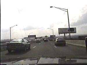 This is the end of the Walt Whitman Bridge, on I-76 west in Philadelphia, Pennsylvania. The expressway ahead is the Schuykill Expressway. Filmed July 1, 1999. |