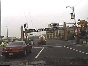 This is the end of 14th Street, I-78 west, in Jersey City. The cross street ahead is Jersey Avenue. I-78 continues west as the New Jersey Turnpike Newark Bay Extention, which is directly ahead. Filmed July 3, 1999. |