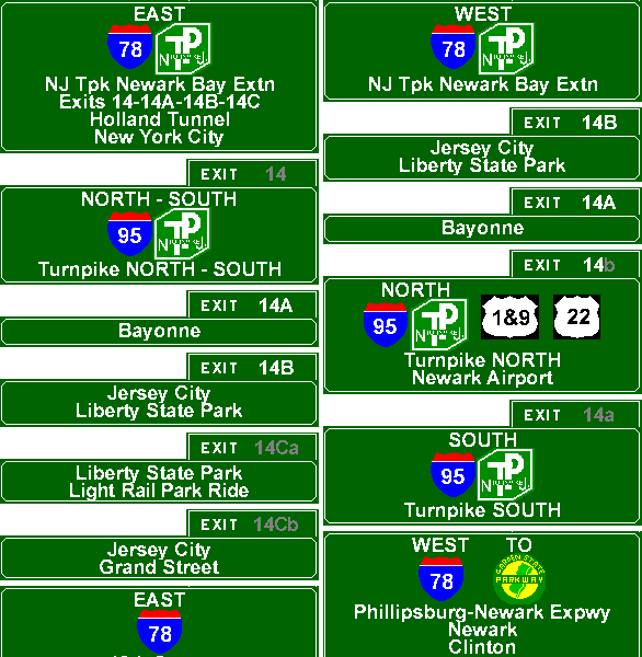 | New Jersey Turnpike Newark Bay Extention (I-78) Eastbound | New Jersey Turnpike Newark Bay Extention (I-78) Westbound | ||||||||||||||
