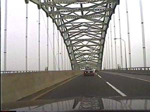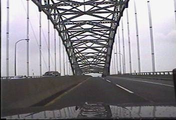 | This is the New Jersey Turnpike Newark Bay Extention, I-78 east, half way across the main span of the Bayonne-Port Newark Bridge, entering Bayonne from Newark. Filmed July 1, 1999. |