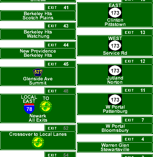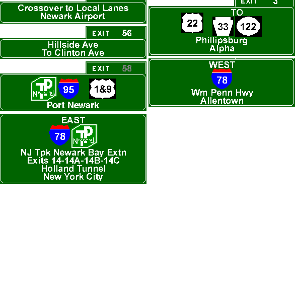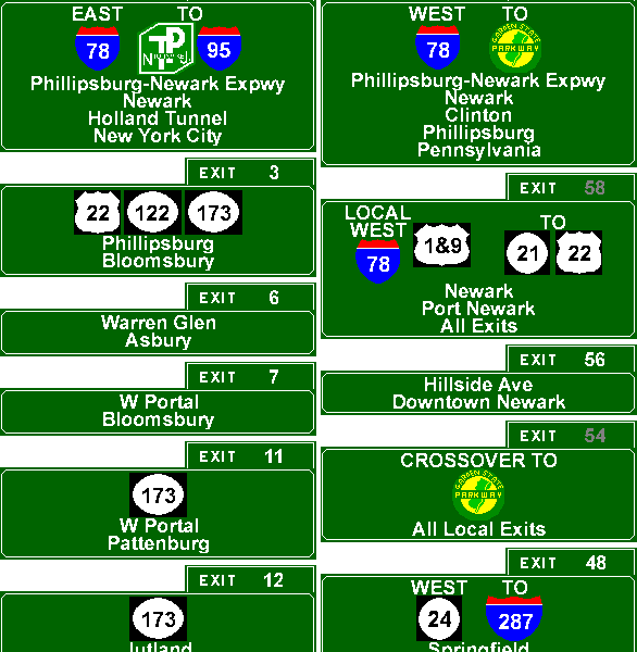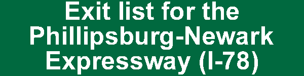 Exit list for the Phillipsburg-Newark Expressway (I-78). Exit graphics courtesy of Jeff Taylor and Scott Oglesby. |