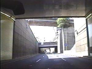 | This is the end of the George Washington Bridge, lower level, I-95 south, emerging from the tunnel from the lower level in Fort Lee Boro, New Jersey. I-95 continues south as the Bergen-Passaic Expressway. Filmed August 24, 1999. |