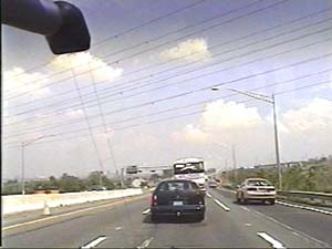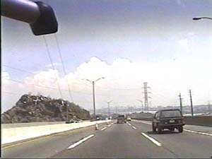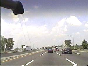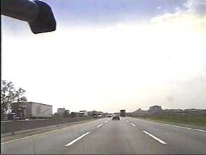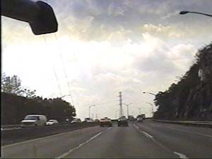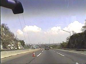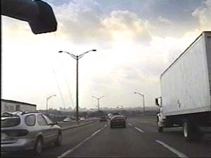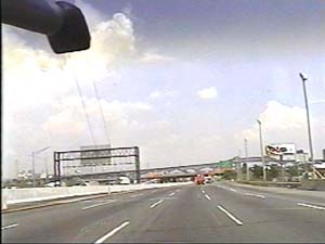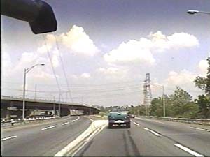 | This is the New Jersey Turnpike Eastern Spur, I-95 (Eastern Route) south, south of the exit 16E toll plaza in Secaucus. The ridge on the right is Laurel Hill. Filmed August 24, 1999. |
