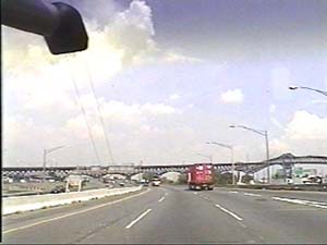 | This is the New Jersey Turnpike Eastern Spur, I-95 (Eastern Route) north, at exit 15E(Newark, Jersey City) in Newark. The bridge in the distance is the Pulaski Skyway, US 1&9. Filmed August 24, 1999. |