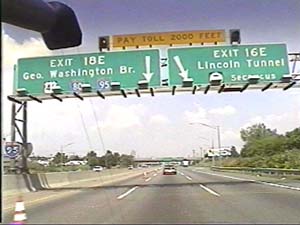 | This is the New Jersey Turnpike Eastern Spur, I-95 (Eastern Route) south, at exit 17(NJ 3, Secaucus, Lincoln Tunnel) in Secaucus. Filmed August 24, 1999. |