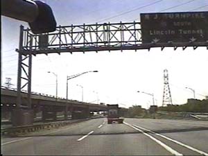 | This is the New Jersey Turnpike Eastern Spur, I-95 (Eastern Route) south, just north of exit 17(NJ 3, Secaucus, Lincoln Tunnel) in Secuacus. Filmed August 24, 1999. |
