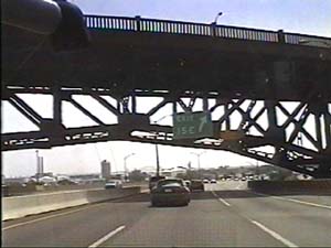 | This is the New Jersey Turnpike Eastern Spur, I-95 (Eastern Route) south, at exit 15E(Newark, Jersey City) in Newark. The bridge overhead is the Pulaski Skyway, US 1&9. Filmed August 24, 1999. |