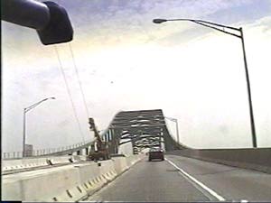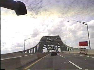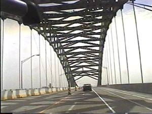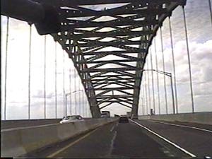 This is the beginning of the main span of the Pennsylvania Turnpike Delaware River Bridge, I-95 (Eastern Route) south, in Burlington Township, New Jersey. Filmed August 25, 1999. |