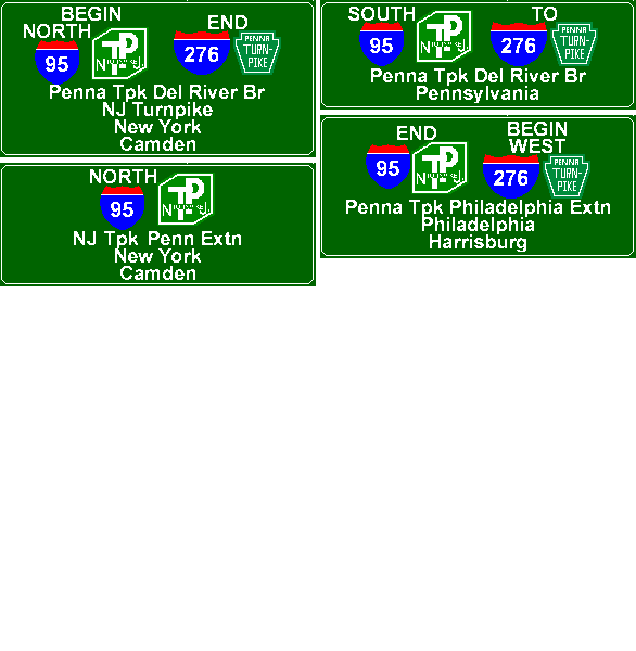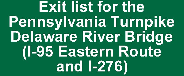 Exit list for the Pennsylvania Turnpike Delaware River Bridge (I-95 Eastern Route and I-276). Exit graphics courtesy of Jeff Taylor and Scott Oglesby. |