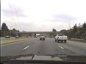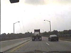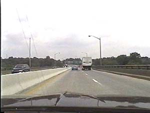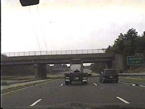 | This is the Scudders Falls Expressway, I-95 (Western Route) south, south of exit 4(NJ 31, Ewing, Pennington) in Ewing Township. The two overpasses ahead carry Lower Ferry Road and the Reading Railroad accross the expressway, which dips to allow the railroad to cross at the original grade. Filmed August 13, 1999. |