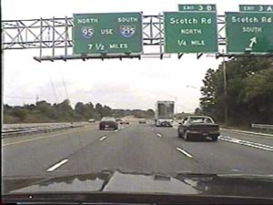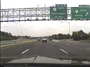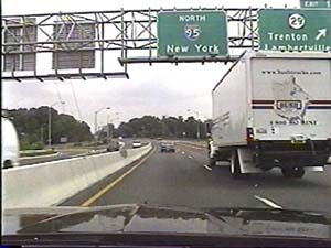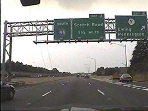 | This is the Scudders Falls Expressway, I-95 (Western Route) south, at exit 2(CR 579, West Trenton, Trenton-Mercer Airport) in Ewing Township. Filmed August 13, 1999. |