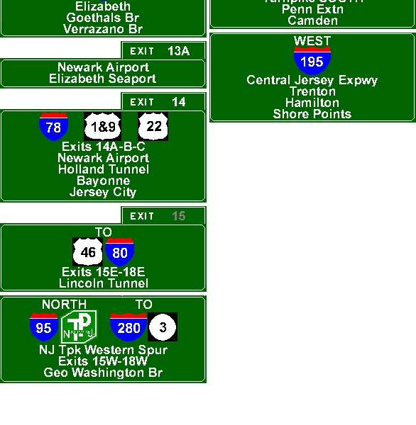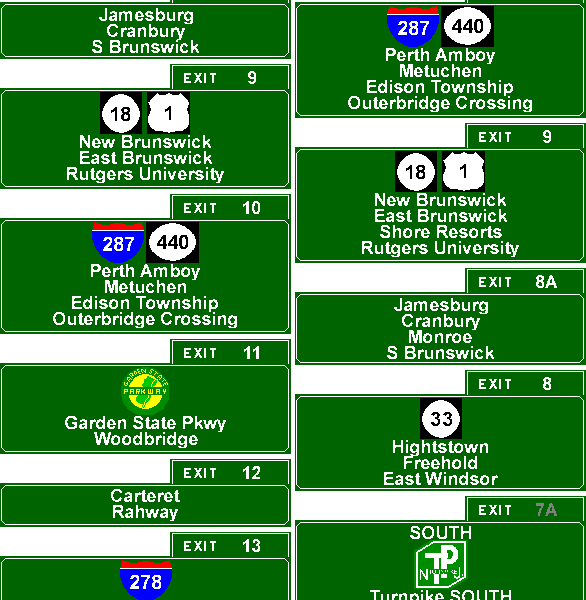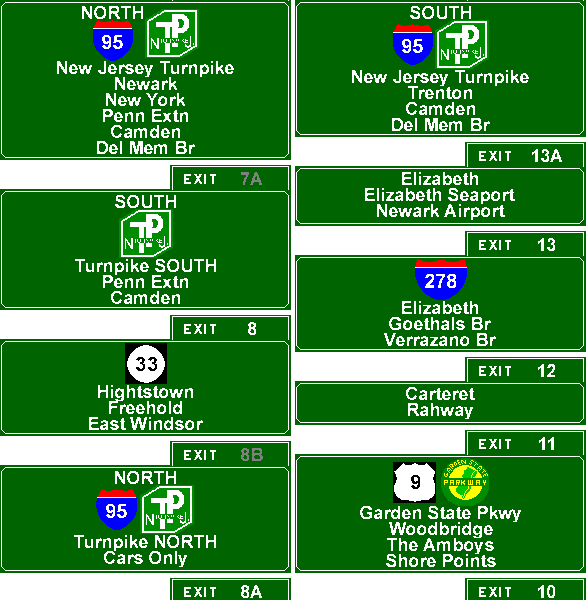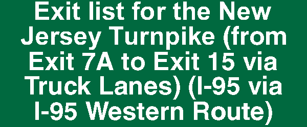 Exit list for the New Jersey Turnpike (from Exit 7A to Exit 15 via Truck Lanes) (I-95 via I-95 Western Route). Exit graphics courtesy of Jeff Taylor and Scott Oglesby. |