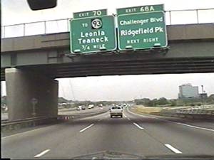 | This is the New Jersey Turnpike Northern Extention, I-95 south, at exit 68(US 46, Teaneck Road, The Ridgefields) in Ridgefield Park. Originally, the New Jersey Turnpike began just ahead, but all of I-95 north of the original mainline turnpike was 'sold' to the NJTP in 1992. Filmed August 13, 1999. |