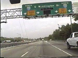 | This is the New Jersey Turnpike Northern Extention, I-95 north, just north of exit 68(Challenger Boulevard, Ridgefield Park) in Ridgefield Park, at the express lane / local lane split. The electronic sign above uses an arrow to indicate which lanes are the best route to the George Washington Bridge. Filmed August 13, 1999. |
