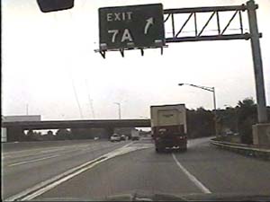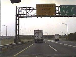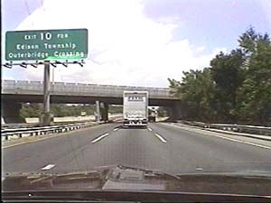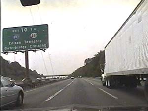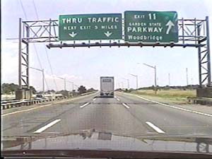 | This is the the New Jersey Turnpike truck lanes, I-95 north, at exit 11(Garden State Parkway, Woodbridge) in Woodbridge Township. Filmed July 20, 1999. |