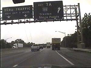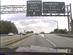 | This is the New Jersey Turnpike, I-95 south, at exit 7A(South New Jersey Turnpike, Pennsylvania Extention, Camden) in Washington Township. The unofficial I-95 (Western Route) leaves the New Jersey Turnpike here. Filmed August 13, 1999. |