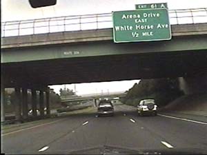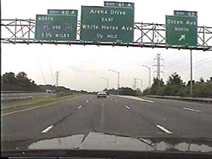 | This is the Camden Freeway, I-95 (Western Route) south, a.k.a. I-295 north, approaching exit 61(Arena Drive, Whitehorse Avenue, Olden Avenue) in Hamilton Township. Filmed August 13, 1999. |