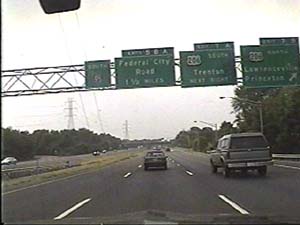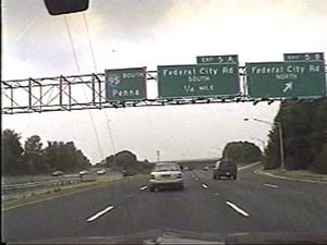 | This is the Camden Freeway, I-95 (Western Route) south, at exit 5(Federal City Road) in Lawrence Township. Filmed August 13, 1999. |