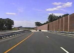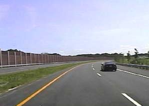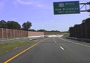 | This is the Hightstown Bypass (NJ 133) eastbound west of Exit 2(North US 130, New Brunswick) in East Windsor Township. Another feature of the route is heavy sound barrier usage, another result of high community opposition. Filmed August 17, 2000. |