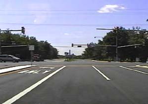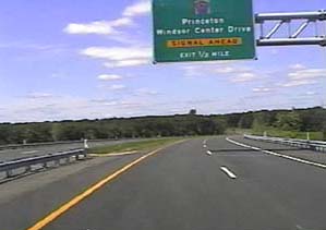 | This is the end of the Hightstown Bypass (NJ 133) westbound at Princeton-Hightstown Road (CR 571) in East Windsor Township. The left lane joins Princeton-Hightstown Road (CR 571) eastbound, while the right two lanes continue as Windsor Center Drive directly ahead. Filmed August 17, 2000. |