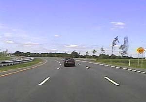 | This is the Hightstown Bypass (NJ 133) eastbound just east of Exit 2(North US 130, New Brunswick) in East Windsor Township. On the right is the line of young trees which was planted along the entire non-sound barrier sections of the freeway, which is yet another result of high community opposition. Filmed August 17, 2000. |