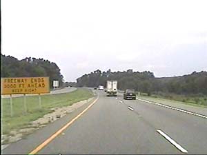 | This is the Sparta Bypass, NJ 15 north, south of exit 14(South NJ 181, Sparta) in Sparta Township. Note the "Freeway Ends" signage on the right, warning of the fast approaching end of the bypass. Filmed August 24, 2000. |