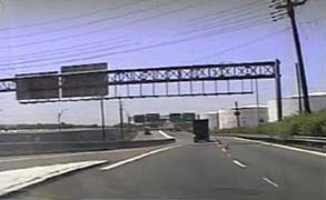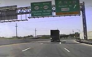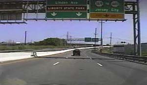 | This is the Cross Bayonne Connector (NJ 440) southbound at Exit 22A(I-78, New Jersey Turnpike, To I-95, Pulaski Street, Port Jersey) in Jersey City. The 'exit' is really a jug-handle that crosses at the traffic signal at the end of the freeway section just ahead. Again note that the old NJ 169 signs had not yet been replaced here. Filmed May 15, 2001. |