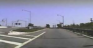 | This is the Cross Bayonne Connector (NJ 440) northbound at Exit 22C(North NJ 185, Linden Avenue, Liberty State Park) in Jersey City. Here, the freeway follows this one-lane ramp to connect the north-south alignment with the east-west alignment parallel to the New Jersey Turnpike Newark Bay Extension (I-78). Visible directly ahead were the now-destroyed Twin Towers of the World Trade Center. The roadway splitting on the left is Cavin Point Road (NJ 185). Filmed May 15, 2001. |