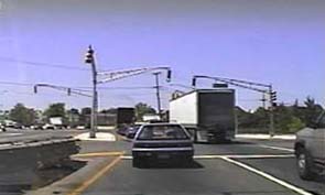 | This is the end of the freeway section of the Cross Bayonne Connector (NJ 440) southbound in Bayonne. From this traffic signal at Pulaski Street south, the road is a divided arterial with at-grade intersections. Filmed May 15, 2001. |