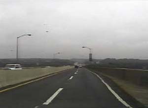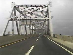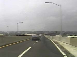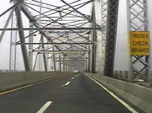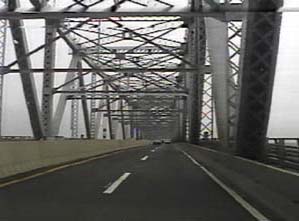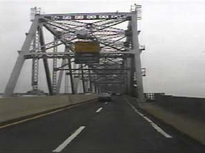 | This is the middle of the Outerbridge Crossing (NJ 440) northbound, crossing the Arthur Kill from Perth Amboy, New Jersey to Staten Island, New York. NJ 440 becomes NY 440 here, and CR 501 (which is multiplexed with NJ 440) disappears and 'ghosts' NY 440 through Staten Island, reappearing at the Bayonne Bridge (NJ 440) as it re-enters New Jersey. Filmed July 30, 2000. |