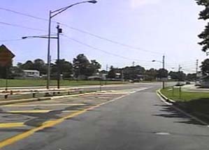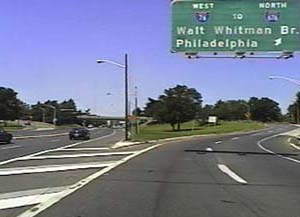 | This is the end of the Walt Whitman Bridge Approach (NJ 76C) southbound in Haddon Township. The roadway merging from the left is the Black Horse Pike (NJ 168) southbound. The roadway continues as the Black Horse Pike (NJ 168), a divided arterial. Filmed August 21, 2000. |