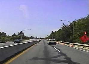 | This is the Walt Whitman Bridge Approach (NJ 76C) northbound south of Exit 2(North I-676, Camden, Ben Franklin Bridge) in Haddon Township. Note the deteriorated condition of the roadway. Since this was filmed, the roadway has undergone a reconstruction. Filmed August 21, 2000. |