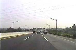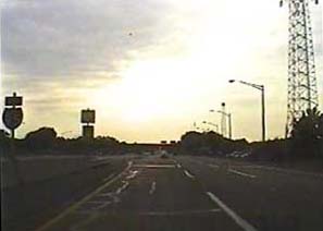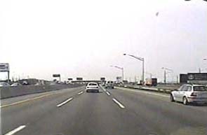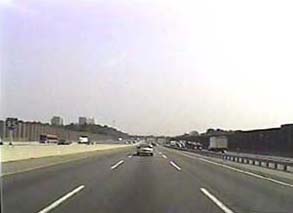 | This is the New Jersey Turnpike Eastern Spur (I-95) northbound south of the merge of the New Jersey Turnpike Western Spur (I-95 as the Western Route) and New Jersey Turnpike Eastern Spur (I-95 as the Eastern Route) in North Bergen. The surrounding marshes of the Meadowlands are visible on the right. Filmed August 9, 2000. |