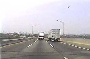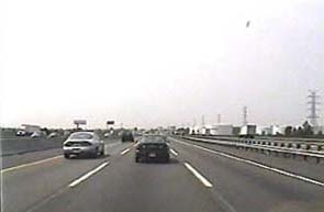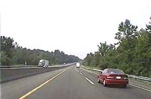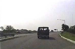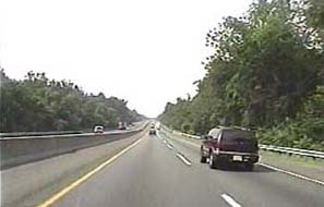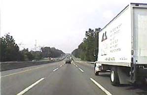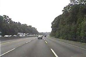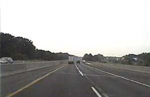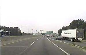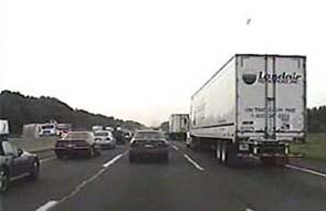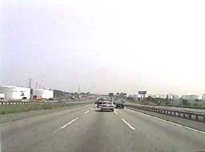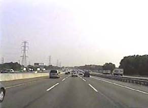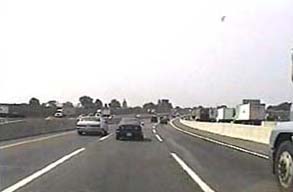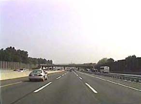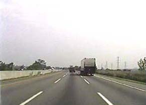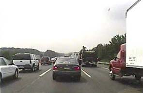 | This is the New Jersey Turnpike (I-95) southbound just north of Exit 8(NJ 33, Hightstown, Freehold, East Windsor) in Cranbury Township. The cause of the 2-mile backup in the southbound roadway turned out to be the overturned tractor trailor visible on the left in the northbound lanes. This sort of delay is called 'rubber-necking' because its cause is motorists who slow down to see what happened. Filmed August 7, 2000. |