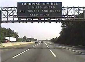 | This is the New Jersey Turnpike (I-95) northbound north of Exit 8(NJ 33, Hightstown, Freehold, East Windsor) in Cranbury Township. The sign above notes the approaching dualization of the turnpike into car and truck lanes. Filmed August 9, 2000. |
