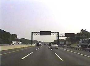 | This is the New Jersey Turnpike car lanes (I-95) northbound north of Exit 9(NJ 18, US 1, New Brunswick, East Brunswick, Rutgers University) in Edison Township. Visible ahead are 2 new variable message signs. Separate from the older neon signs controlled by the NJTA, these are controlled by NJDOT and were still being tested at the time. Filmed August 9, 2000. |