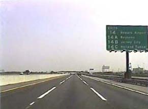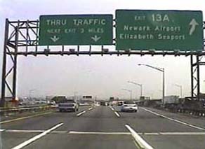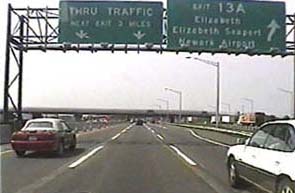 | This is the New Jersey Turnpike car lanes (I-95) northbound at Exit 13A(Newark Airport, Elizabeth Seaport) in Elizabeth. Filmed August 9, 2000. |