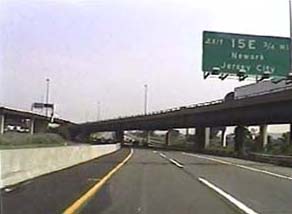 | This is the New Jersey Turnpike Eastern Spur (I-95) northbound north of Exit 15E(Newark, Jersey City) in Kearny. The Hackensack River Bridge is visible in the distance on the right. Filmed August 9, 2000. |
