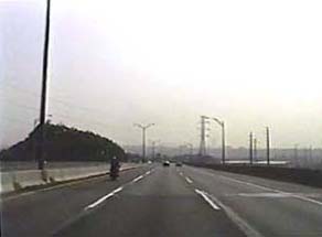 | This is the New Jersey Turnpike Eastern Spur (I-95) northbound south of Exit 16E(NJ 3, Lincoln Tunnel, Secaucus) crossing the Hackensack River Bridge from Kearny into Secaucus. Laurel Hill is visible on the left, and had this been a clearer day, the NYC skyline would be visible as well. Filmed August 9, 2000. |