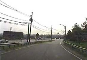 | This is the New Jersey Turnpike Eastern Spur (I-95) southbound south of the split of the New Jersey Turnpike Eastern Spur (I-95 as the Eastern Route) and the New Jersey Turnpike Western Spur (I-95 as the Western Route) in Ridgefield Boro. The Vince Lombardi Service Plaza is on the right. It is the only turnpike service plaza which can be reached and then returned from without paying a toll. Filmed August 7, 2000. |