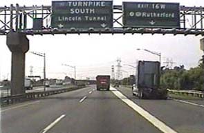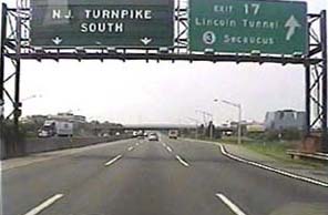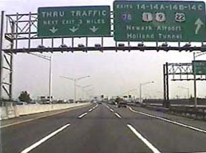 | This is the New Jersey Turnpike Eastern Spur (I-95) southbound at Exit 17(NJ 3, Lincoln Tunnel, Secaucus) in Secaucus. Filmed August 7, 2000. |