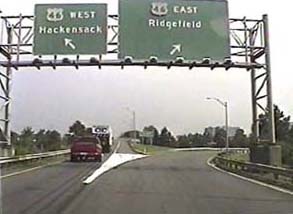 | This is the New Jersey Turnpike Eastern Spur (I-95) northbound at the merge of the New Jersey Turnpike Western Spur (I-95 as the Western Route) and the New Jersey Turnpike Eastern Spur (I-95 as the Eastern Route) in Ridgefield Boro. This is the only location where the original carriageway has been redesigned, as it no longer leads directly to US 46. The redesign took place in 1971 when NJDOT built the New Jersey Turnpike Northern Extension, which connects the mainline turnpike to the Bergen-Passaic Expressway. The new extension was necessary in order for I-95 to directly connect to the George Washington Bridge. Note the old signage, which has since been replaced. Filmed August 9, 2000. |