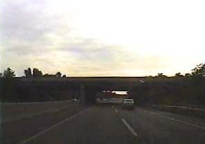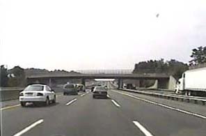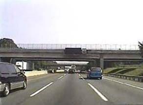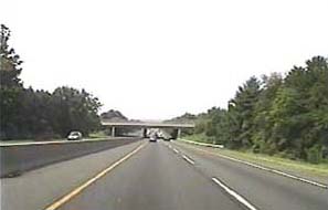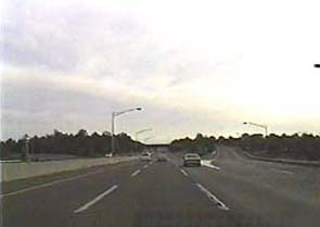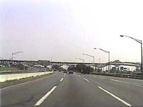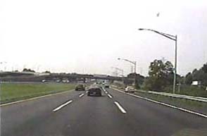 | This is the New Jersey Turnpike car lanes (I-95) southbound just south of Exit 11(US 9, Garden State Parkway, Woodbridge, The Amboys, Shore Points) in Woodbridge Township. The lower of the double overpasses ahead is the Garden State Parkway. Filmed August 7, 2000. |
