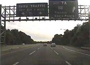 | This is the New Jersey Turnpike (I-95) southbound at Exit 7A(I-195, Trenton, Hamilton, Shore Points) in Washington Township. Here, the unofficial I-95 Western Route leaves the turnpike and follows the Central Jersey Expressway (I-195), while the official I-95 (as the Eastern Route) continues down the turnpike. Filmed August 16, 2000. |