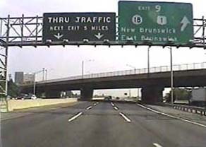 | This is the New Jersey Turnpike car lanes (I-95) southbound at Exit 9(NJ 18, US 1, New Brunswick, East Brunswick, Shore Resorts, Rutgers University) in New Brunswick. Filmed August 7, 2000. |