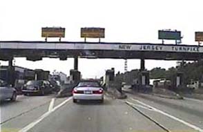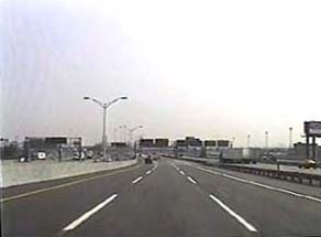 | This is the New Jersey Turnpike Eastern Spur (I-95) southbound south of exit 17(NJ 3, Lincoln Tunnel, Secaucus) in Secaucus. This is the northern mainline toll barrier. Filmed August 7, 2000. |