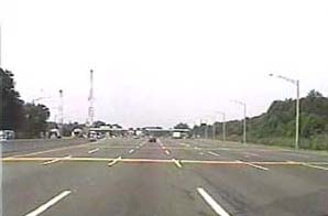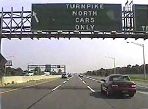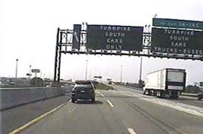 | This is the New Jersey Turnpike (I-95) northbound at the beginning of the dualized section of the turnpike in Cranbury Township. Here, the turnpike divides into a "Cars Only" roadway and a "Cars - Trucks - Buses" roadway. These are more commonly known as the "car lanes" and the "truck lanes", respectively. Filmed August 9, 2000. |