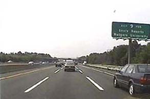 | This is the New Jersey Turnpike car lanes (I-95) southbound north of Exit 9(NJ 18, US 1, New Brunswick, East Brunswick, Shore Resorts, Rutgers University) in Edison Township. Filmed August 7, 2000. |