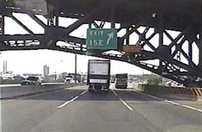 | This is the New Jersey Turnpike Eastern Spur (I-95) northbound at Exits 16E(NJ 3, Lincoln Tunnel, Secaucus) and 18E in Secaucus. The toll plaza visible ahead serves both Exits 16E and 18E, and is the end of the toll ticket system. Filmed August 9, 2000. |
