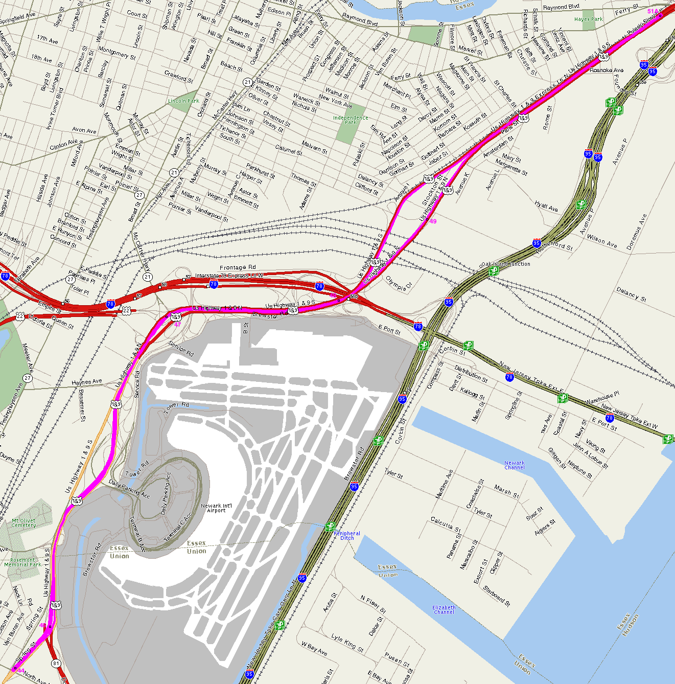 | Connecting Maps US 1&9 NORTH US 1&9 (Local Lanes) NJ 81 US 22 Other Maps NJDOT's Straight Line Diagram pictures / map / exit list / article (Steve Anderson) Back to New Jersey Expressways and Tollways |